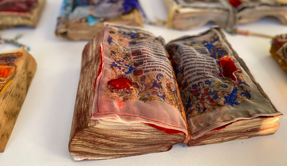 Her ‘Reliquaries’ series transforms unsettling objects into delicate relics, prompting reflection on memory and what we hold sacred. The ‘Paradoxes’ book pieces, inspired by illuminated texts, reveal complexity in religious history, while ‘Spilling Her Guts’ and ‘Thinking Out Loud’ uncover internal experiences through visceral arrangements. Amanda’s organic process lets materials shape each piece, inviting viewers to consider their own lives and relationships.
