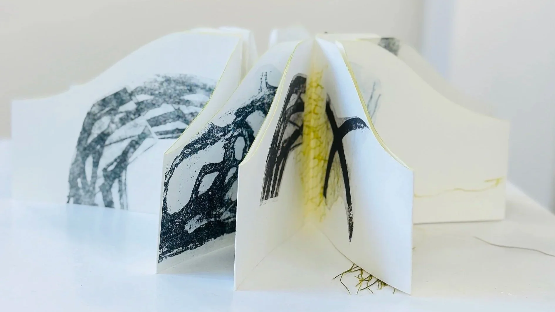 Her practice includes working directly with her hands manipulating commonplace fabrics which are portable, soft, and comforting. She seeks to evoke a quiet and reflective calm, making connections with the minimum of tools. Labour intensive and time-consuming, it grants space for rhythm, repetition, listening and reflection. Each new environment is a fresh encounter. Beginning with numerous rapid, small sketches to document her experiences she takes time to reflect and gather inspiration. Transforming fleeting moments into a personal story assembled from the fragments. This process brings her a sense of comfort, both physically and emotionally.