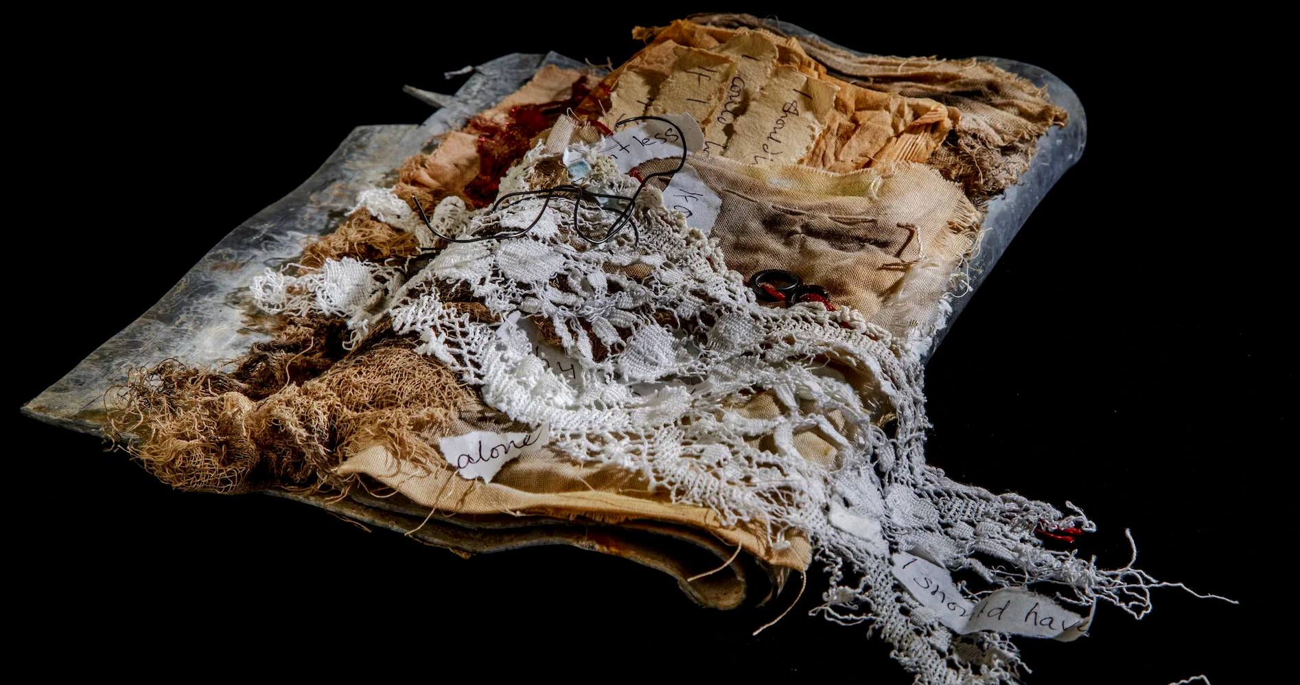 Her techniques depend upon the requirements of the concept and may include stitch, fabric manipulation, printing, and text, while the materials range from vintage linens and cottons to plastics, wire, and plaster, each specifically chosen to express the concept. The process can be quite physical, emotional, repetitive, and therapeutic.