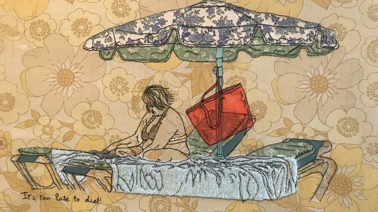 Caroline’s work can be seen as a series of snapshots reflecting on the ups and downs of life and is intended to be a contemporary social study of today’s society. Through observation she embarks on a narrative journey to record scenarios that capture her imagination. She translates and records stories and emotions into documentary style stitched textile drawings, the starting point of which is a comment or saying, which strikes a poignant cord.