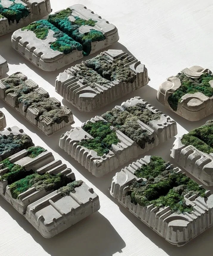 She creates her signature textiles using a combination of embellishing and embroidery. The embellisher blends the fabrics together to create subtle variations in texture and tone. The concrete captures the embossed patterns of the plastics representing manmade structures giving a weight and presence more in-line with its legacy. The naturally inspired textiles emphasise the way our waste becomes subsumed into the environment but also how nature fights back.