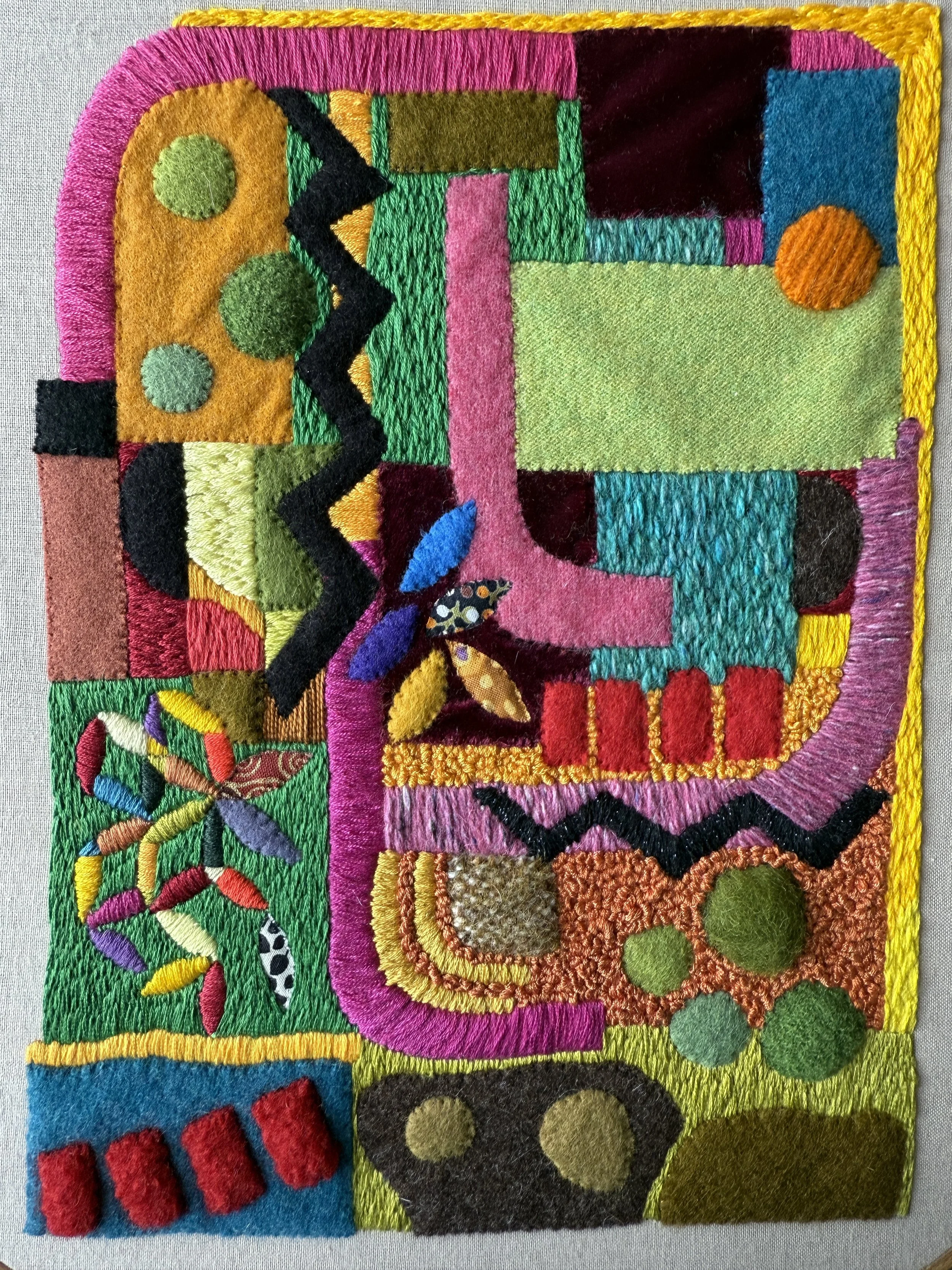 Drawing on the tactile language of cloth, I use embroidery, appliqué, and collage to construct abstract compositions that echo both traditional textile practices and contemporary storytelling. The contrast between textured, raised surfaces and the flatter, graphic qualities of print and stitch allows me to play with visual tension—inviting the viewer to look closely and reflect on what is revealed and what remains hidden.